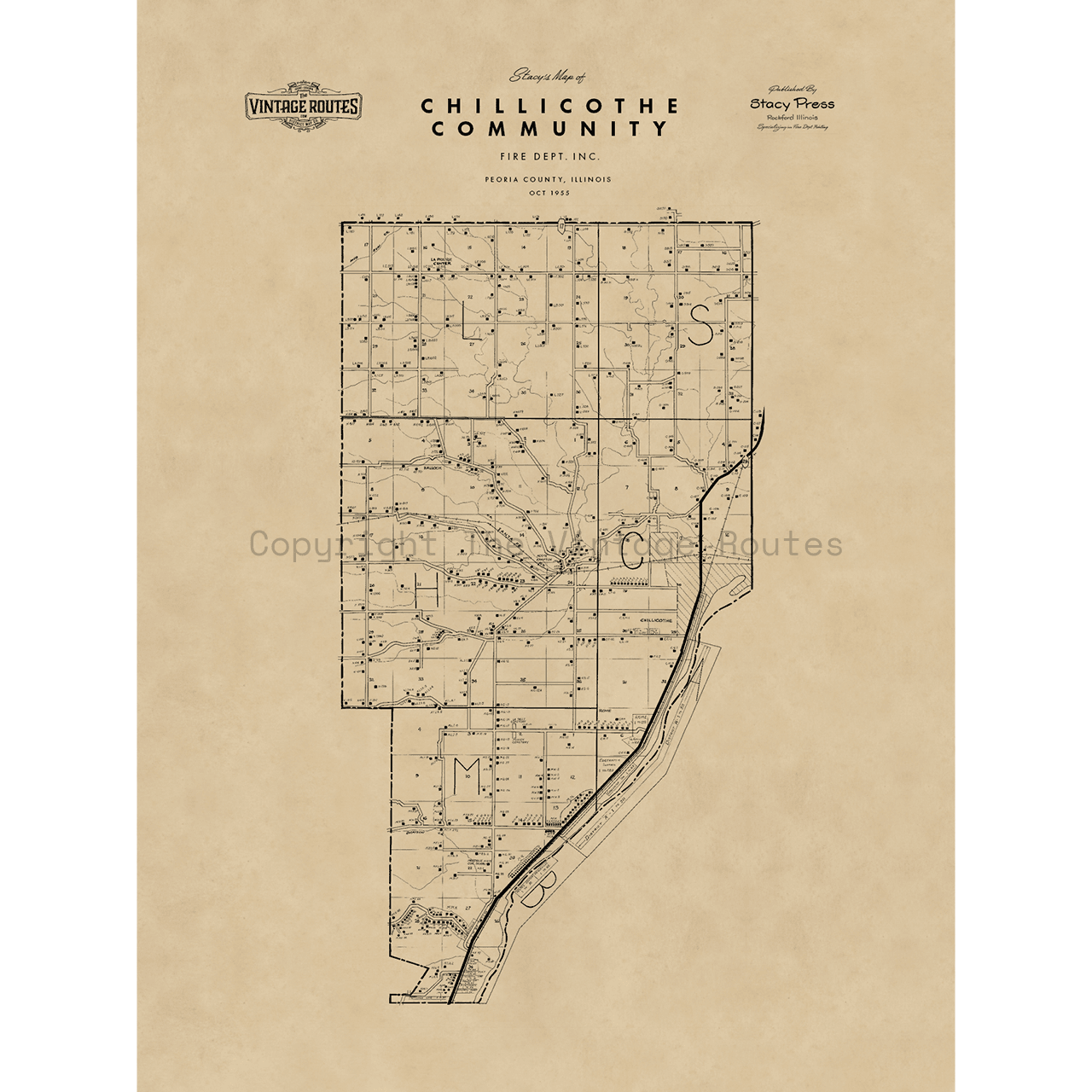 This hand-drawn map was created in 1955 for the Chillicothe Community Fire Department in Chillicothe, Illinois. The original has been professionally scanned and carefully restored to preserve its historical integrity.