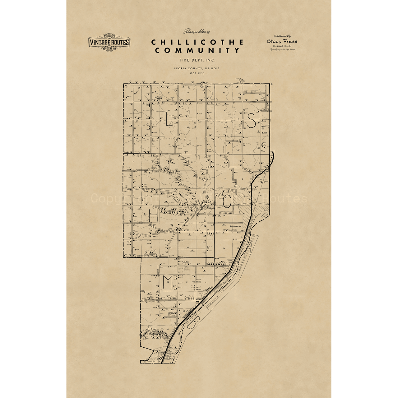 This hand-drawn map was created in 1955 for the Chillicothe Community Fire Department in Chillicothe, Illinois. The original has been professionally scanned and carefully restored to preserve its historical integrity.