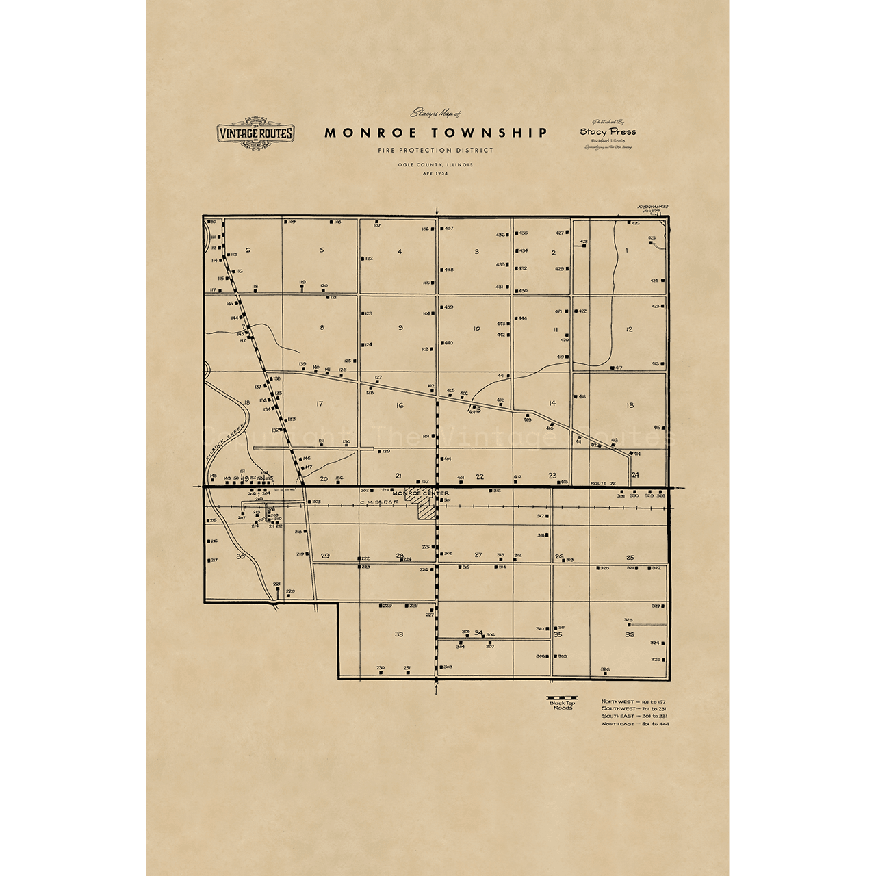 This hand-drawn map was created in 1954 for the Monroe Township Fire Protection District in Ogle County, Illinois. The original has been professionally scanned and carefully restored to preserve its historical integrity.