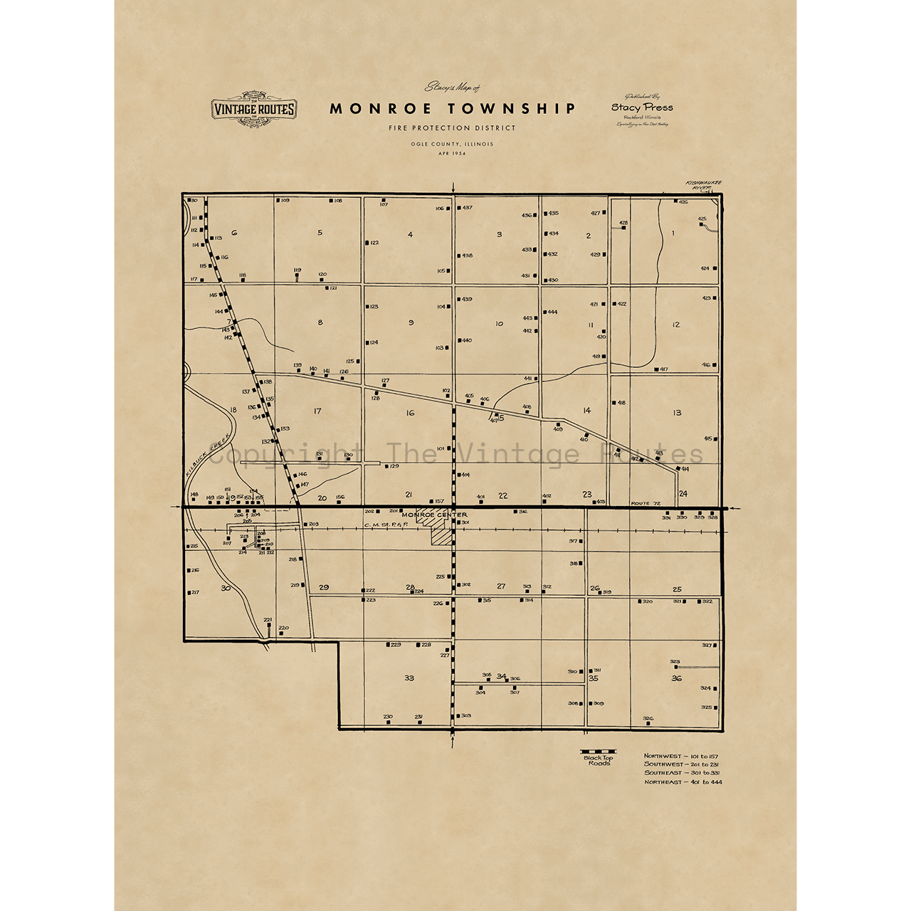 This hand-drawn map was created in 1954 for the Monroe Township Fire Protection District in Ogle County, Illinois. The original has been professionally scanned and carefully restored to preserve its historical integrity.