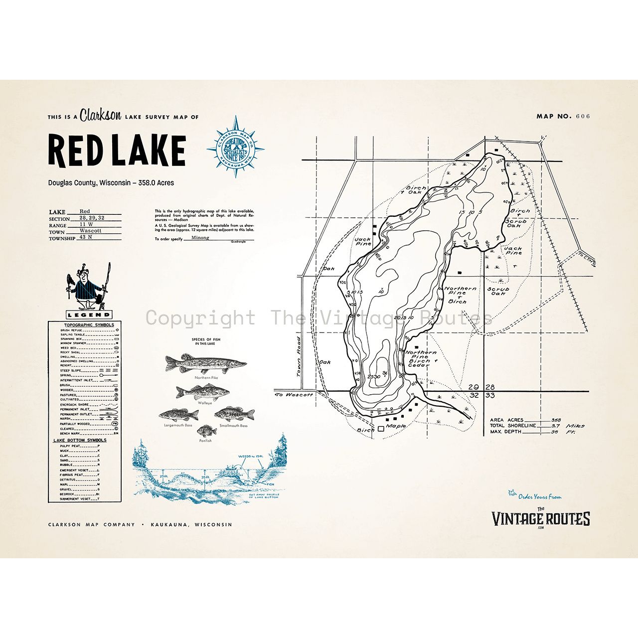 This hand-drawn map of Red Lake in Douglas County, Wisconsin, features hydropgraphic readings, topographic legend, listing of fish species indigenous to the lake, and fun retro clip art. Available in Modern White or Vintage background.
